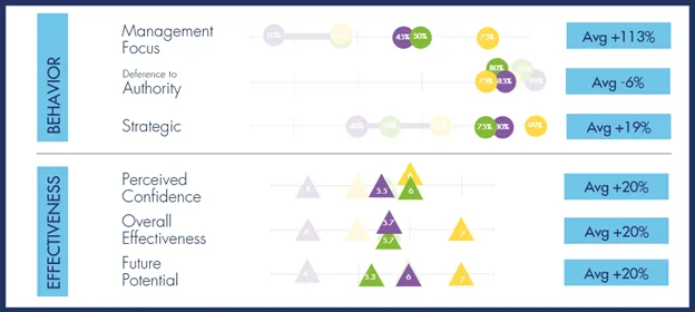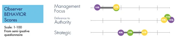 Andre’s Management Focus scores increased by an average of 113%, with his boss’s rating jumping from 35 to 75. This showed significant growth in his ability to provide direction and lead his team effectively. His Deference to Authority decreased by 6%, reflecting a growing confidence in his decision-making and independence. And his Strategic scores increased by 19%, demonstrating his ability to share his ideas more openly and align them with the organization’s goals.